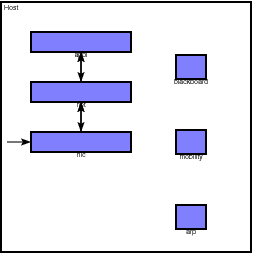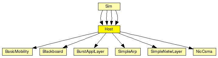 module Host gates: in: radioIn; // gate for sendDirect submodules: blackboard: Blackboard; display: "p=200,75;b=30,25"; mobility: BasicMobility; display: "p=200,150;b=30,25"; arp: SimpleArp; display: "p=200,225;b=30,25"; appl: BurstApplLayer; display: "p=90,50;b=100,20,rect"; net: SimpleNetwLayer; display: "p=90,100;b=100,20,rect"; nic: NicCsma; display: "p=90,150;b=100,20,rect"; connections: nic.uppergateOut --> net.lowergateIn; nic.uppergateIn <-- net.lowergateOut; nic.upperControlOut --> net.lowerControlIn; net.uppergateOut --> appl.lowergateIn; net.uppergateIn <-- appl.lowergateOut; net.upperControlOut --> appl.lowerControlIn; radioIn --> nic.radioIn; display: "p=10,10;b=250,250,rect;o=white"; endmodule